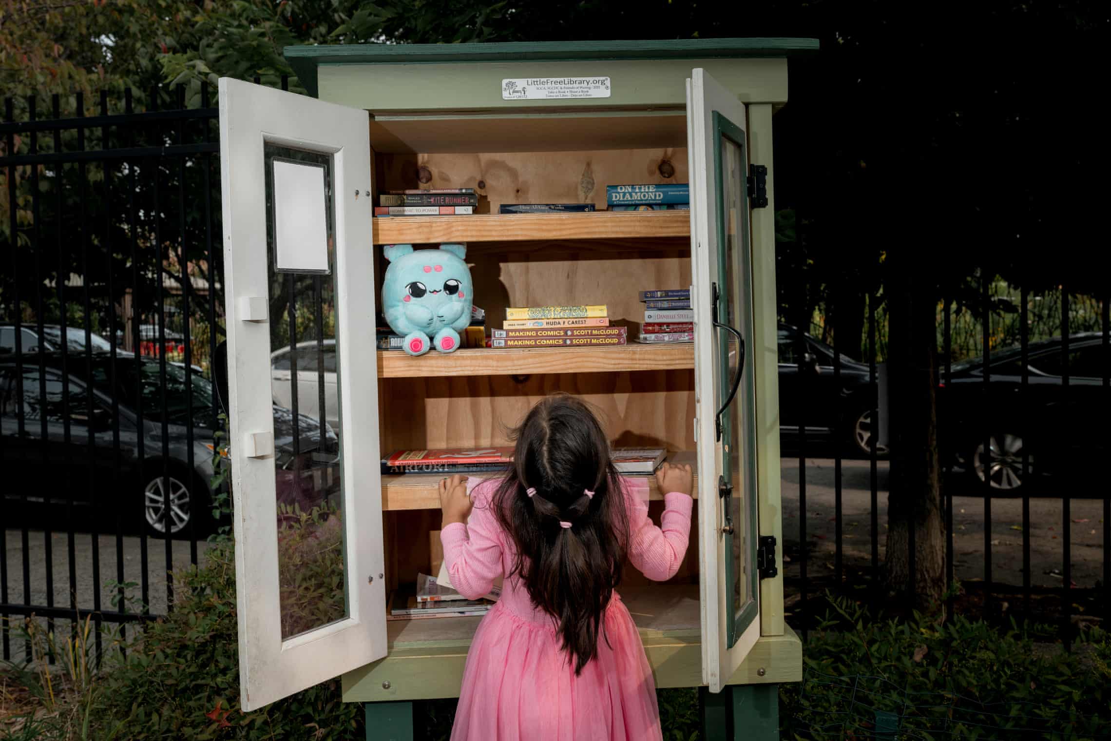 Grem visits a local free library. Photograph: Hannah Yoon/The Guardian