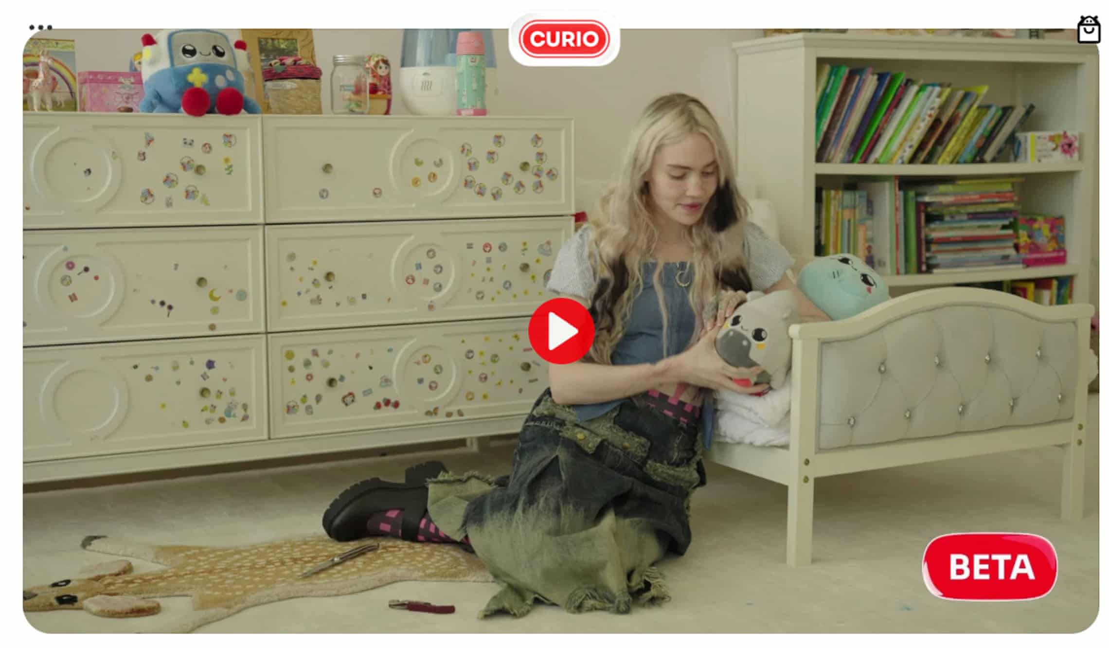 Cutting edge … Grimes in Curio’s promo video for the AI toy, seated on the floor beside a knife.