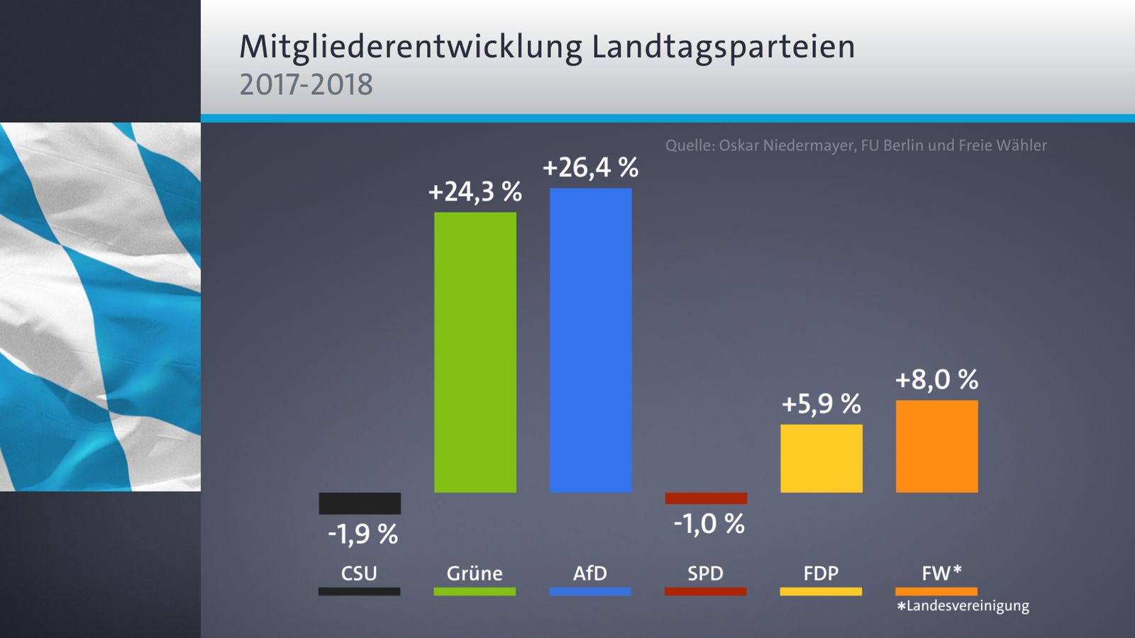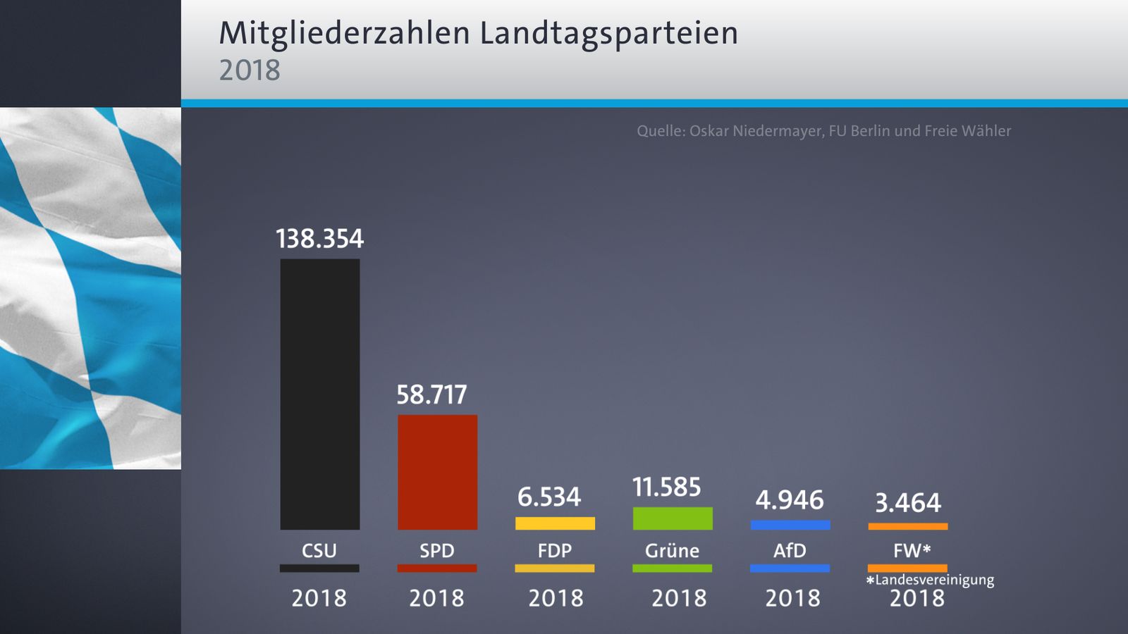 Auch die beiden anderen im Landtag vertretenen Parteien konnten einen leichten Mitglieder-Anstieg verbuchen. Die bayerische FDP hatte Ende 2018 insgesamt 6.534 Mitglieder - knapp sechs Prozent mehr als im Vorjahr. Bei der Landesvereinigung der Freien Wähler waren es 3.464 Mitglieder, ein Zuwachs von acht Prozent. Hier gibt es allerdings eine Besonderheit, denn bei den Freien Wählern existiert zusätzlich ein sogenannter Landesverband mit mehr als 41.000 Mitgliedern laut offiziellen Angaben.